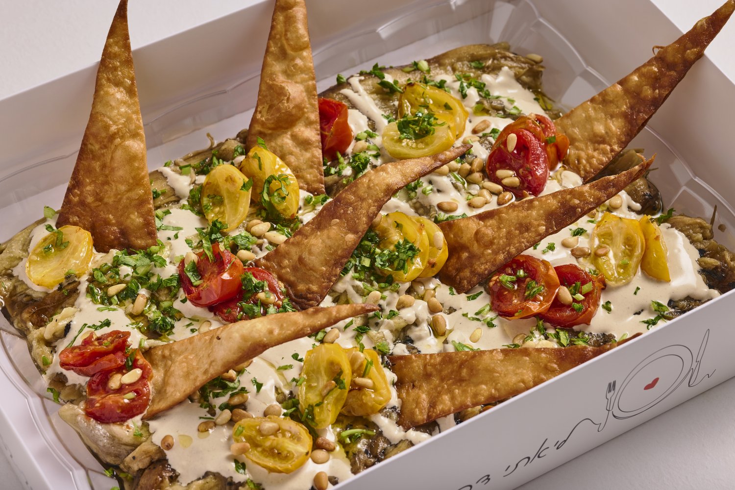 חציל קלוי על האש, טחינה, סלסת עגבניות, שום קונפי ופטרוזיליה קצוצה